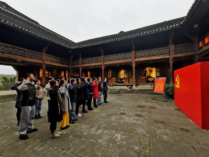 在会址,党员们在党委副书记黄暐的领誓下,面向党旗,重温了入党誓词。庄严的宣誓仪式使大家的心灵受到了一次震撼和洗礼。