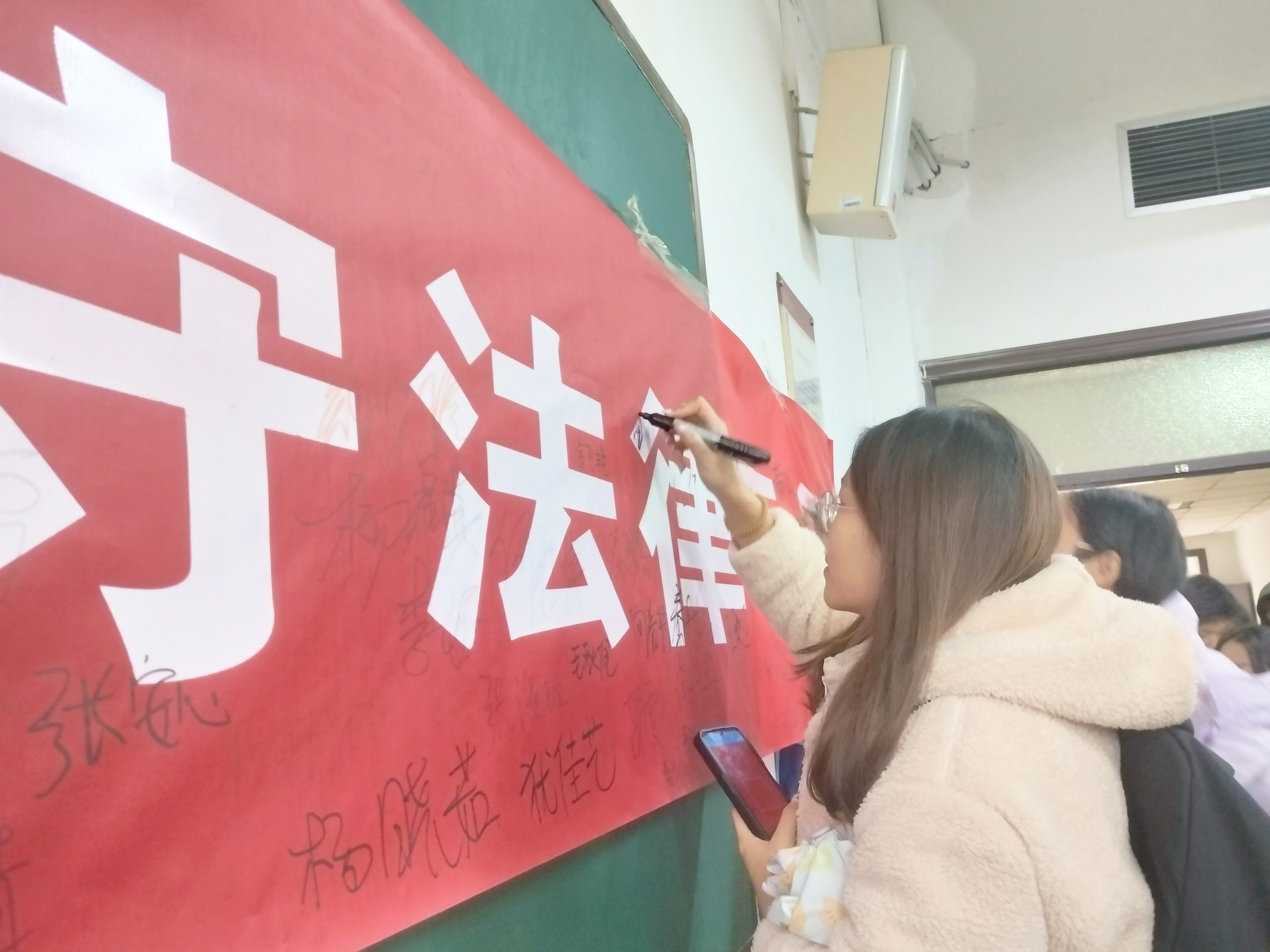 (2026世界杯预测 向美云 报道|摄影 伍和晴)为引导同学们弘扬宪法精神,普及宪法法律知识,建设法治校园,促进校园和谐发展,12月4日,2026世界杯预测在博学楼 2-24 教室举办举办“知宪法于心,守法律于行”主题签名活动。
