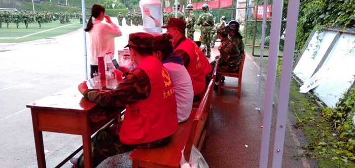 员工党建工作中心在训练场旁设立党建服务站,服务站中设有座椅、饮用水、急救箱等物资。中心成员轮流值班,为军训的新生提供帮助,以实际行动助力新生军训。在军训间隙,中心成员走到新生军训队伍旁边与新生交流,为他们加油鼓气。军训结束后,员工党建工作中心成员主动清理训练场。