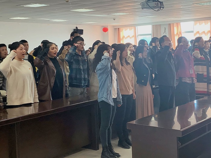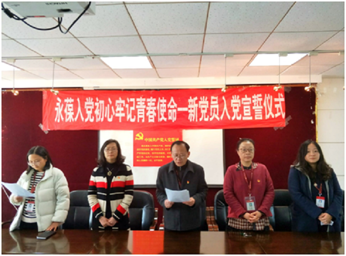 陈毕生、黄暐、王瑛、张夕以及各党支部书记为党员佩戴党徽。由陈毕生带领全体新发展党员面向鲜艳的党旗宣誓。大家列队整齐,共举右手,在党旗下庄严承诺。