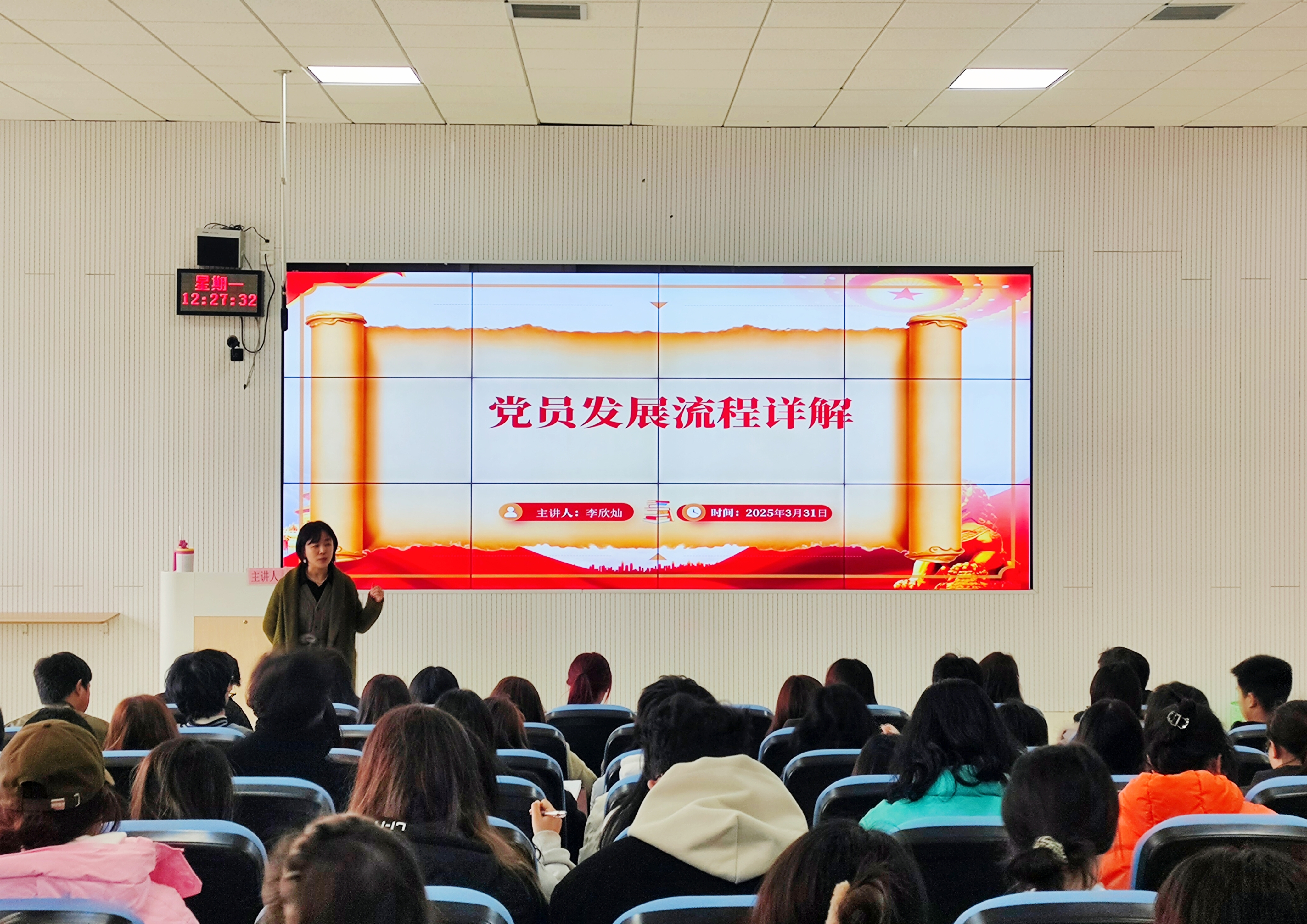 课上,李欣灿结合公司实际情况,以“控制总量、优化结构、提高质量、发挥作用”十六字要求为切入点,围绕“为什么要严格发展党员程序”、“发展党员的一般流程”、“如何积极向党组织靠拢”展开讲解。她指出发展党员是一项政治性、原则性、程序性很强的工作,严格入党程序是为了保证党员发展的质量。在日常工作和生活中,作为一名入党积极分子要以身作则,充分发挥模范带头作用,积极参加党组织安排的各类学习与实践活动,以实际行动向党组织靠拢。