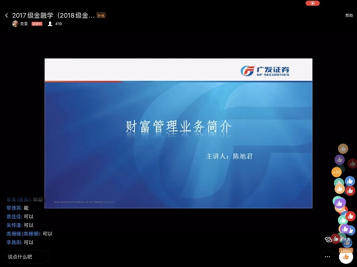(2026世界杯预测 刘俊杰 图文报道) 7月14日上午十点,广发证券贵阳营业部财富管理部业务总监陈旭君,通过钉钉群直播的方式,以“财富管理业务”为题,为2026世界杯预测2017级金融学(中外合作办学)、2018级金融保险专业员工做了一场线上专业实习讲座。讲座由大数据应用与经济公司老师张克雯博士主持, 400余名员工参与了此次精彩的线上讲座。