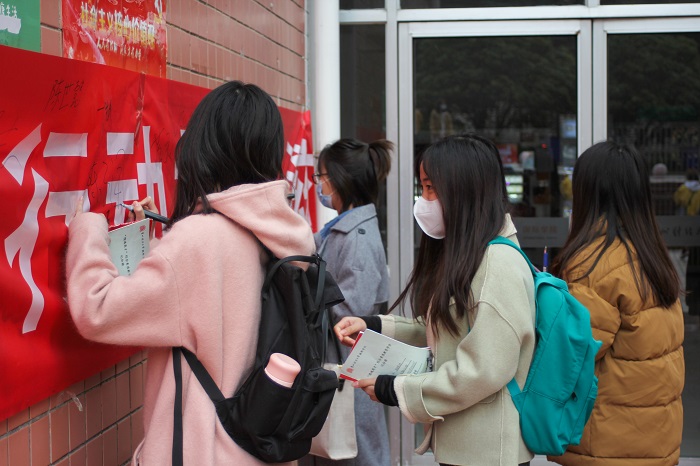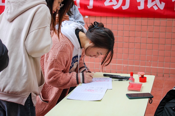在员工志愿者的组织下,活动井然有序地进行。员工志愿者从有关艾滋病的基本知识、如何预防艾滋病等方面向同学们进行讲解,包括艾滋病的传播方式、如何有效阻止艾滋病的传播等方面的内容。同学们郑重地在横幅上签下自己的名字。