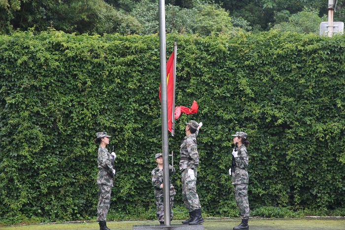 在全体师生的注目礼下,英姿飒爽的国旗护卫队成员迈着铿锵的步伐走向升旗台,在激昂的《义勇军进行曲》中,鲜艳的五星红旗如初升的太阳般冉冉升起,迎风飘扬,全体师生神情凝重,目光随着国旗一点点在升高一股使命感责任感在师生的心头油然而生,汇聚成一股无形的精神力量全体师生奏唱国歌,深怀对祖国无限的热爱和崇高的敬意。