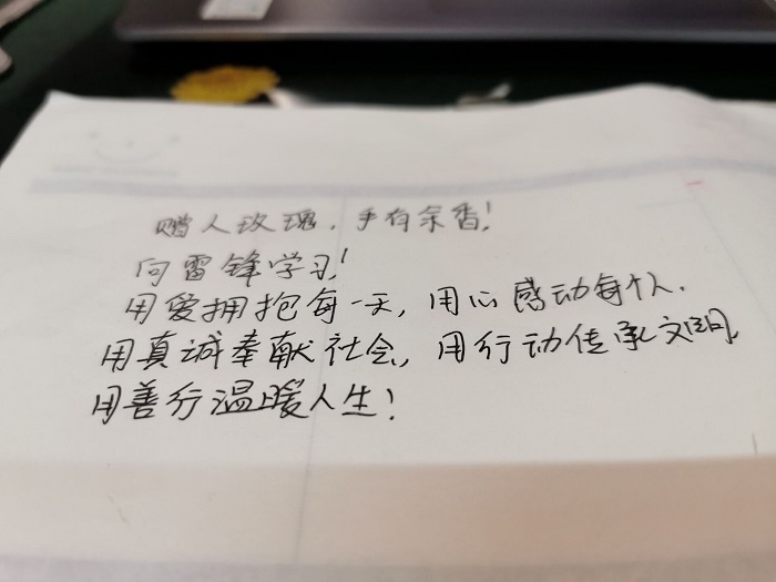 同学们以写下“爱心暖贵财”心愿贴、录制视频的方式来提倡学雷锋志愿服务精神。