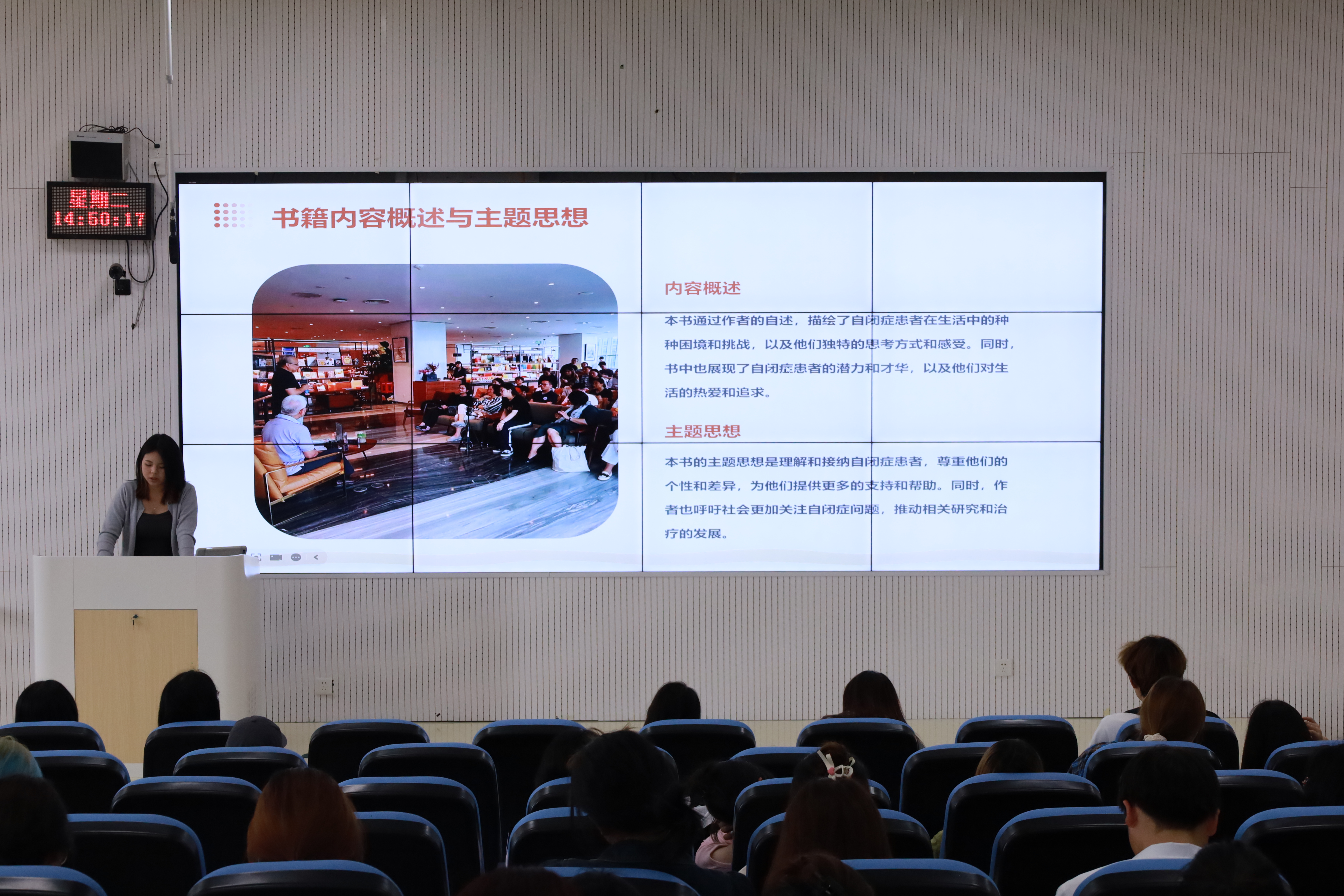 活动现场,同学们热情高涨,积极参与。分享的书目包括《这世界唯一的你》《房思琪的初恋乐园》《天堂旅行团》《边城》《人间失格》《因梦而生》《我想飞进天空》《皮囊》以及《爸爸爱喜禾》等。这些作品从不同角度探讨了人性、情感与社会问题,引发了同学们的深思与共鸣。在分享环节,同学们纷纷上台,结合自己的阅读体验,对书中的精彩片段进行了深情朗读,并分享了对自闭症患者的理解与感悟。