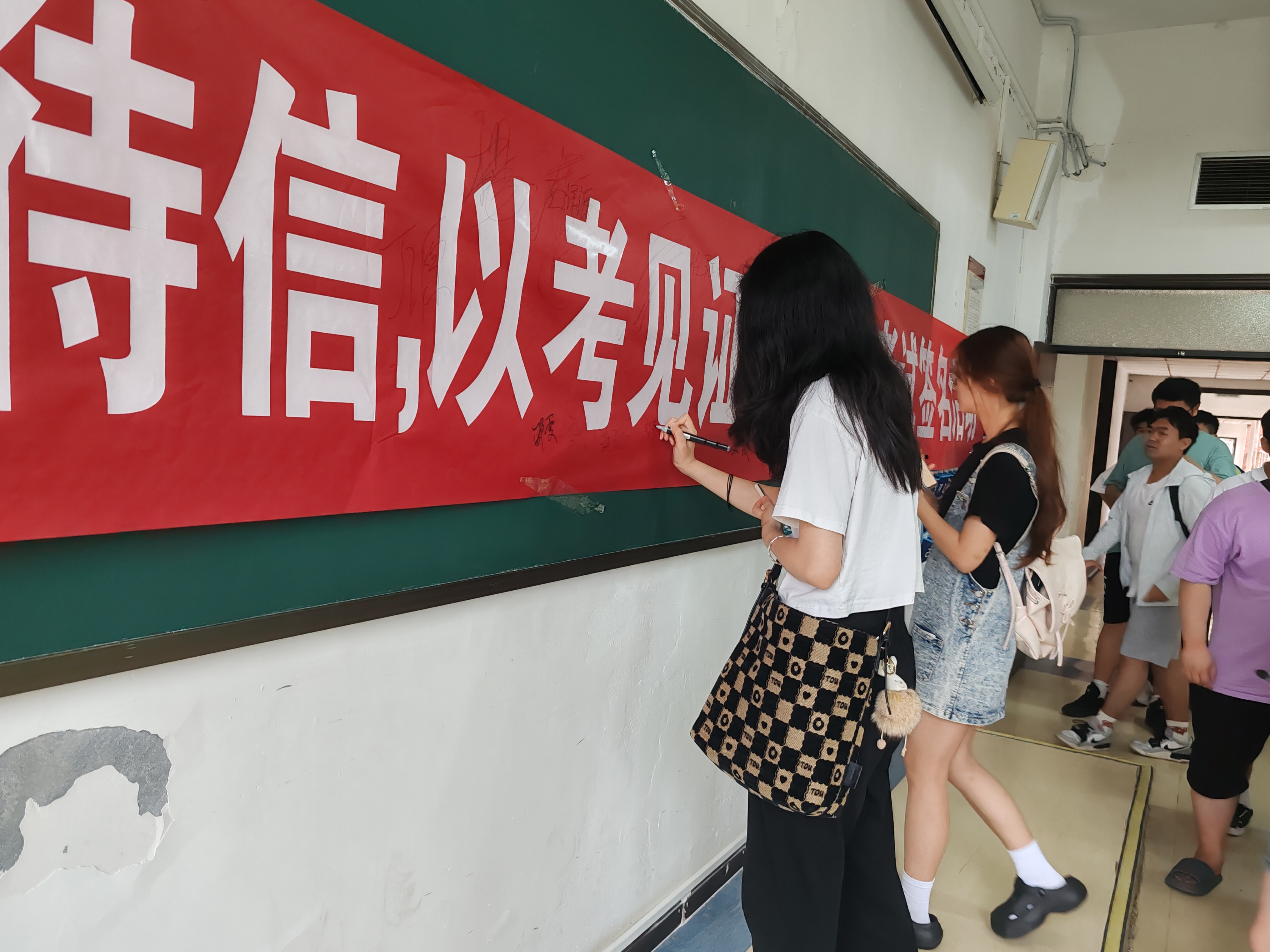 活动现场,工作人员向同学们强调了诚信考试的重要性,提醒同学们要时刻保持清醒的头脑,自觉遵守考试纪律,拒绝任何形式的作弊行为。同学们在横幅上郑重地签下自己的名字,承诺在考试中自觉遵守考试纪律,端正学习和考试的态度,诚信应考,严格遵守考试纪律,自觉抵制作弊行为。这不仅是对诚信考试的承诺,更是对自己学术道德的坚守。现场氛围庄重严肃,每位同学都深刻感受到了诚信考试的重要性。