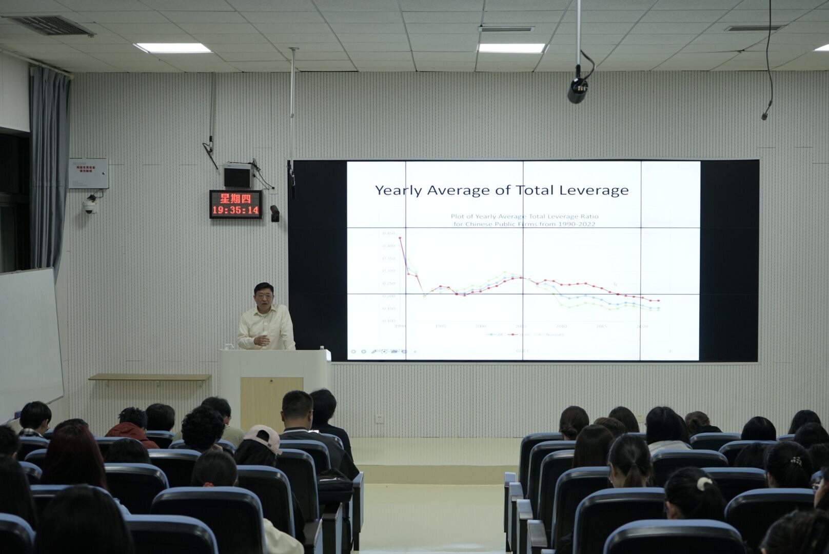 Shaorong Zhang教授结合自身的研究经验,分别从研究调查、相关动机及文献、数据分析以及回归模型等方面进行细致的讲解。此外,Shaorong Zhang教授向在场的师生分享了自己的研究成果:如何通过总杠杆率年均值、长期杠杆率年均值和银行贷款比率年平均值,分析中国上市公司的资本结构。最后,Shaorong Zhang教授为大家总结了1990-2022年中国上市公司的杠杆资本结果决策。