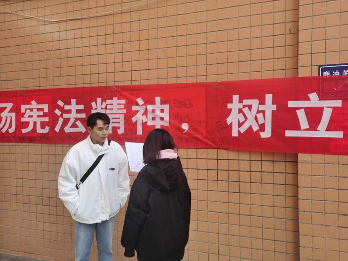 活动现场井然有序,气氛活跃。本次活动设置了横幅签名和宪法知识问答两个环节。在宪法知识问答环节中,同学们通过回答相关宪法知识题目以及工作人员对宪法知识的讲解,进一步巩固了自身的宪法知识,强化了宪法观念和意识。同学们纷纷在“弘扬宪法精神,树立宪法权威”的横幅上郑重地签下自己的名字。