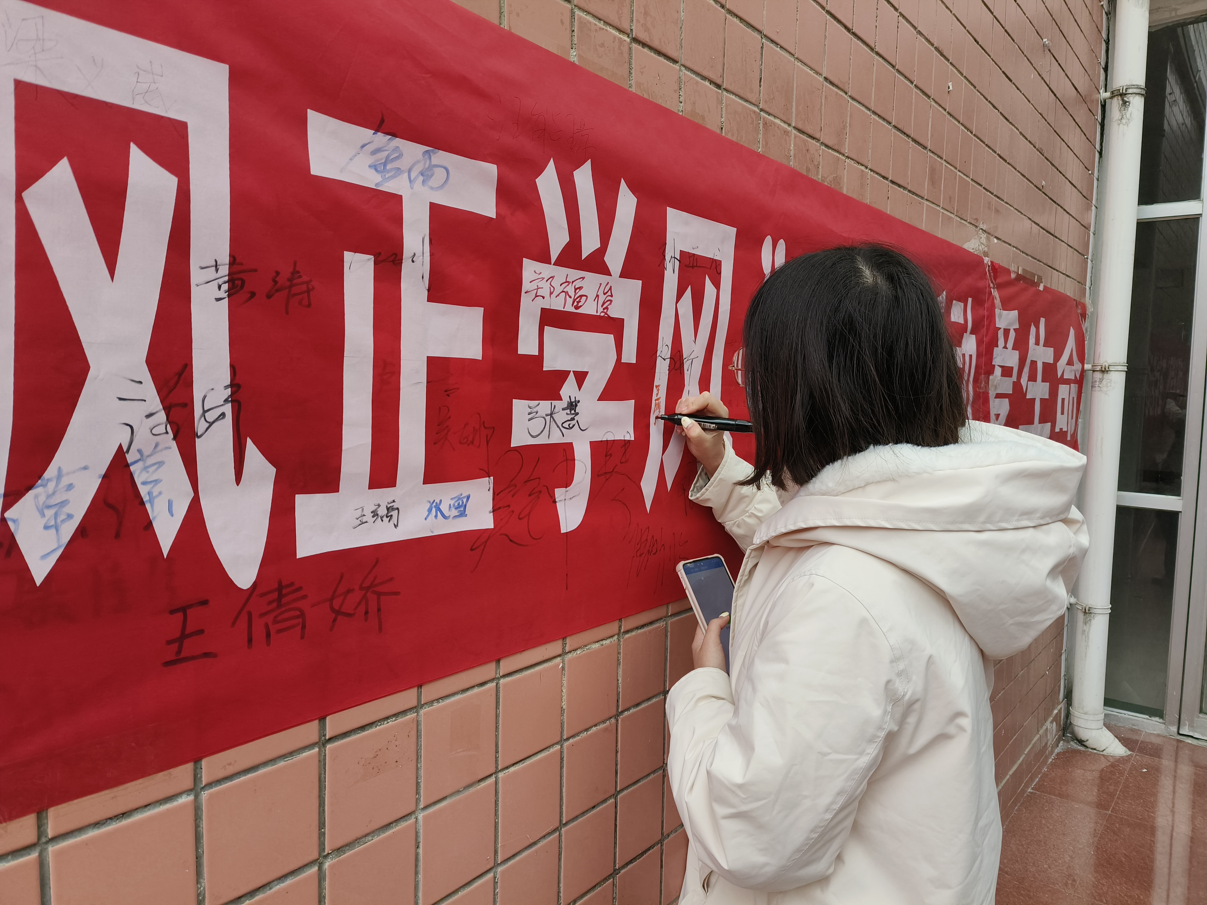 活动现场,在工作人员的组织下,同学们在了解到诚信考试的重要事项以及违反考试纪律的后果后,拿起签字笔,在“弘扬诚信之风,以考风正学风”的横幅上郑重地签上自己的名字,表示将自觉抵制作弊行为,以诚信考试为荣,以违纪违规作弊为耻,树立诚信之风,争做诚信的老员工。