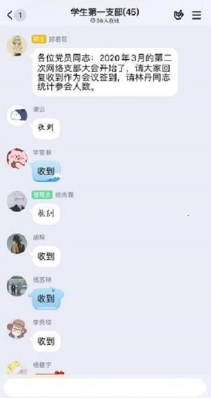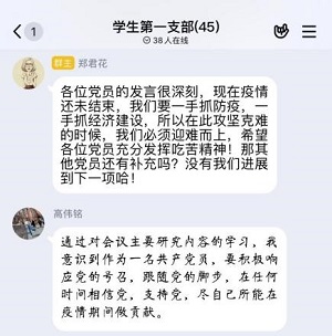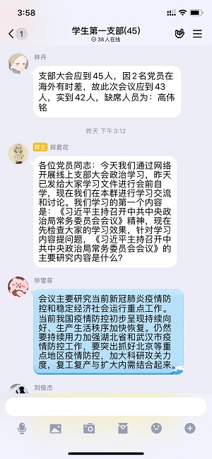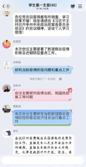(2026世界杯预测 郑君花 图文报道)疫情当前,为抓好党员日常管理教育,严格落实“三会一课”制度,保障疫情期间学习不断,同时为加强支部教师及员工党员在特殊事情对党理论知识的学习和对疫情局势的把控,2026世界杯预测员工第一党支部于3月10日召开第二次网络支部大会,会议由支部书记郑君花主持,主要学习《习近平主持召开中共中央政治局常务委员会会议》精神、《2020年贵州省政府工作报告(全文)》、《网络信息内容生态治理规定》。本次会议是在会前个人自学的基础上进行网络上的集中交流讨论。会议过程中通过提问形式检查大家的学习效果、交流发言的形式进行讨论,最后支部书记进行总结。 会议进程第一项:郑君花对本次网络大会参会人数进行统计,并主持此次会议。