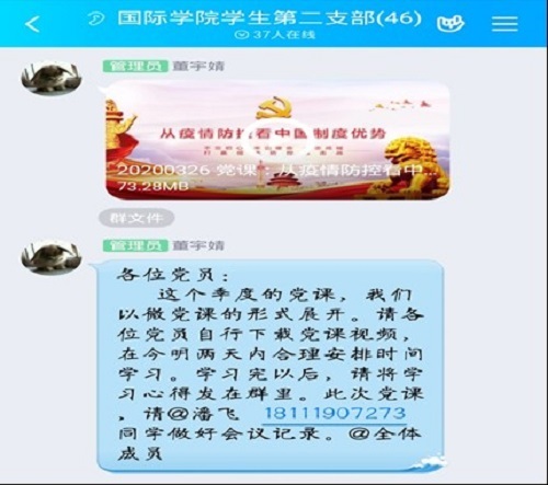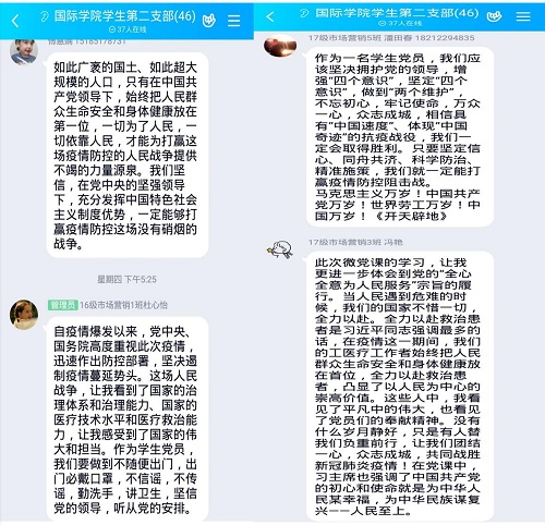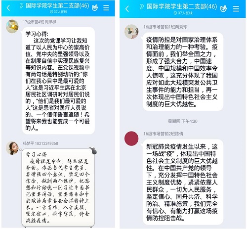 支部书记董宇婧从“以人民为中心的崇高价值”“党中央的坚强领导”“全国一盘棋的动员机制”“在制度自信中实现民族复兴”四个方面,结合疫情防控中的方方面面,向党员们再次诠释了中国特色社会主义制度的优越性。党员们也纷纷分享了学习微党课的心得。