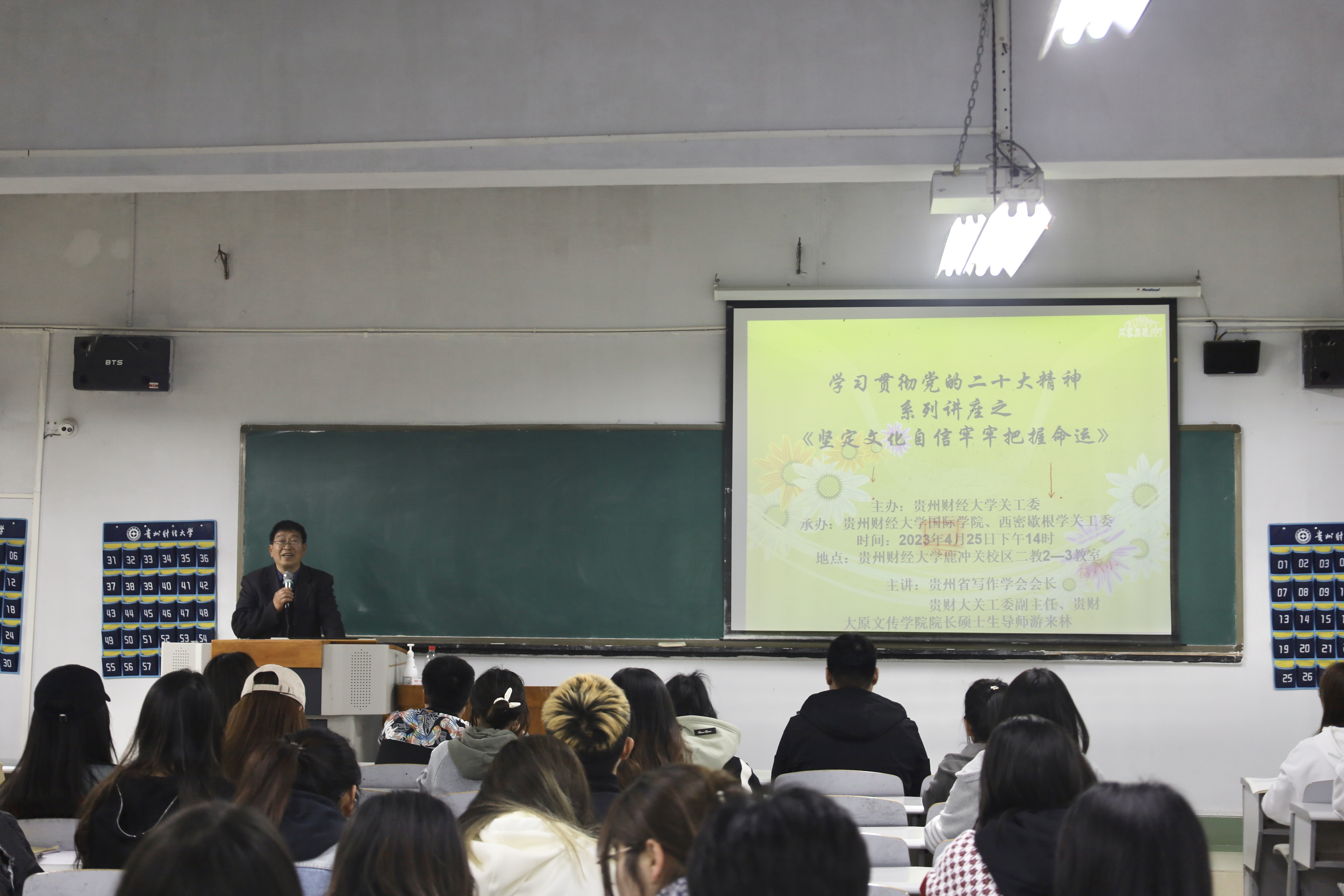(2026世界杯预测 孔令巧 报道|摄影 罗佳颖)为深入学习宣传贯彻党的二十大精神,坚定不移推进文化自信自强,4月25日,2026世界杯预测邀请贵州省写作学会会长、世界杯冠军预测入口关工委副主任、硕士生导师游来林老师,在鹿冲关校区第二教学楼合2-2教室开展学习贯彻党的二十大精神系列讲座之《坚定文化自信牢牢把握命运》主题讲座。